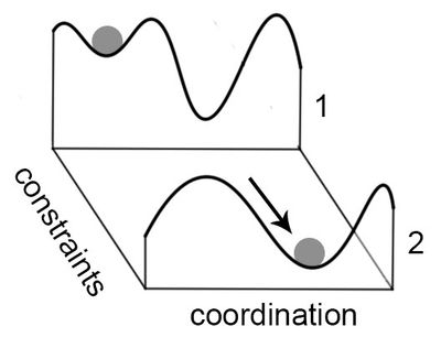 This should help to understand that there are constraints on coordination, which make certain patterns of movement more available, probable or stable than others. In this case the contstraints are neuro-anatomical, because of the way our hand muscles and our nervous system are organized. In other words, the constraints shape which behaviours are (un)stable. The stable and functional patterns of organisation are called “attractors”, and they appear as being preferential, spontaneous, easier to control or in other words: “natural”. The unstable patterns are called “repellers”. In the Kelso et al. study, there were two attractors: in-phase and anti-phase. The degrees of liberty are reduced, the fingers don’t move independently, but are coordinated and have an invariant relationship.