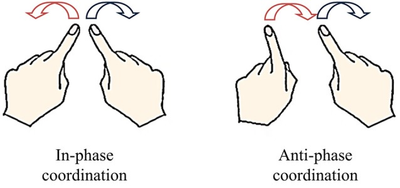 Let’s begin with the classic example studied by Kelso et al.[3] Try wiggling your index fingers from left to right. You should see some patterns appearing, rather than your fingers moving independently from each other. The fingers probably make a simultaneous and identical movement (they move “in-phase”), or a simultaneous but opposed movement (“anti-phase”). These are what we call motor synergies: coordinated and invariant relationships between different parts of our bodies, based on co-variation. When I slow down my movement, both fingers slow down, they act as a single unit, maintaining this relationship. So we have an intention of movement, in this example wiggling our fingers, and then some kind of self-organisation of movement happens. The components of our bodies have self-organizing tendencies, which means we don’t need to micromanage everything, we don’t need to control every tiny degree of freedom.