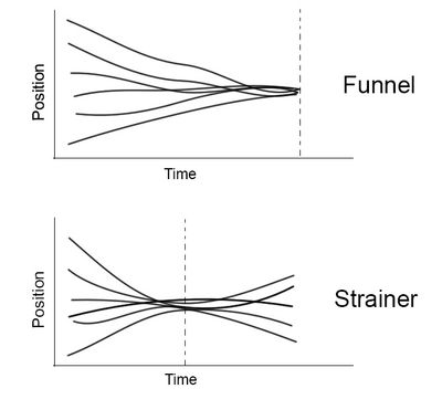 If we accept this, then there must be some way that we compensate for this internal and external variability. Take the blacksmiths: the only way they could use the same pattern of movement each time was if their arms were in the same starting position before every strike. But this would be very hard to do, because when they strike, the hammer rebounds in different ways on the surface. So they need some variability of movement to compensate for the noise, errors and uncontrolled rebounds. The arm takes different trajectories because it doesn’t always start at the same point, but the blacksmith still wants to keep the strike end-point constant. Let’s take another example: you’re trying to figure out your run-up in order to jump from a take-off board[4]. If you keep your stride length constant, you probably won’t end up with your foot on the board. In order to do that, you have to constantly adapt your stride length to your speed, and compensate for unpredictable factors like the wind, your fatigue, etc. One part of the system varies, so other parts must adapt to keep a precise and stable result. I call this the “funnel” model (see graph).